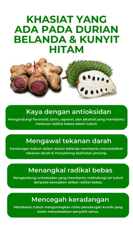 Durian Belanda dari Amerika Selatan dan Kunyit Hitam dari Asia Tenggara telah digunakan sejak ratusan tahun dalam perubatan tradisional kerana khasiat antioksidan, anti-radang, dan menyokong kesihatan tubuh.