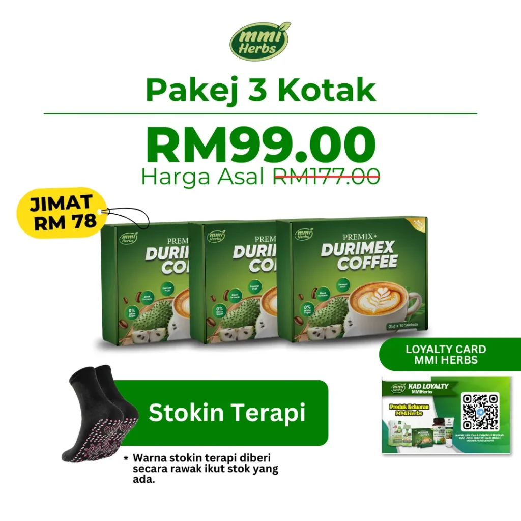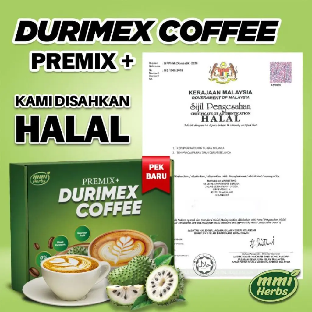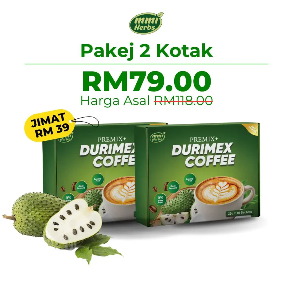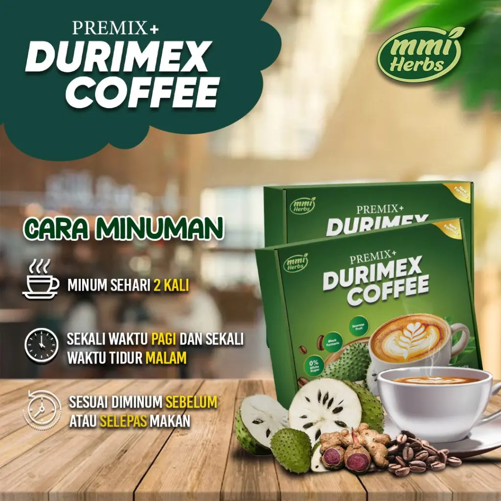 Kopi Durimex adalah minuman botani berasaskan kopi yang diformulasikan dengan Buah & Daun Durian Belanda, Kunyit Hitam & Daun Sacha Inchi untuk menyokong kesihatan saraf & tenaga harian.