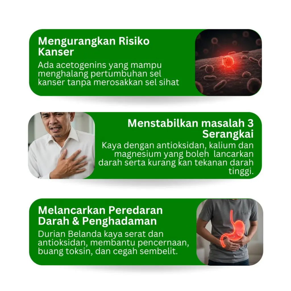 Dari hasil kajian, durian belanda mempunyai kebolehan seperti anti radang dan anti kanser. Hal ini dijelaskan apabila penelitian keatas penduduk di sepanjang Sungai Amazon yang bebas risiko kanser kerana mereka menkonsumsi Graviola iaitu Daun Durian Belanda.
