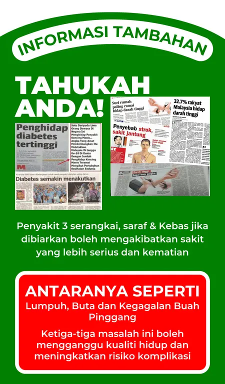 Kami faham, memang penat ulang-alik ke klinik, tapi bacaan gula dan tekanan darah tak pernah turun. Bila cuaca sejuk, kaki mula cramp, tangan dan kaki pula rasa kebas dan berdenyut. Kadang-kadang sampai tak boleh tidur malam.